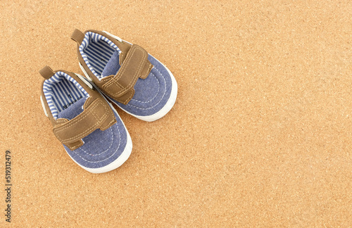 Baby shoes isolated on plywood background with copy space, baby clothing concept