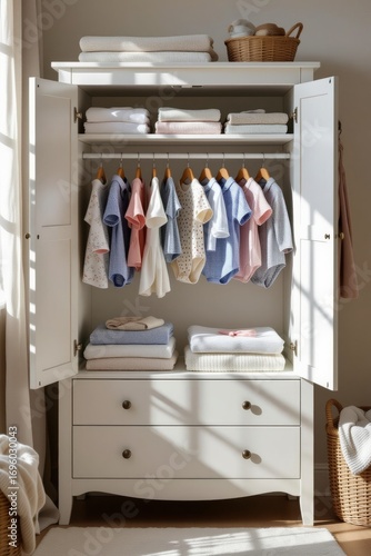 Baby wardrobe open with clothes, neatly folded towels and baby clothes hanging. Concept of baby wardrobe open with clothes showcasing nursery storage and organization.