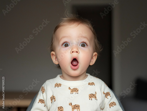 Baby with Surprised Expression Sitting Indoors, Close-Up Portrait