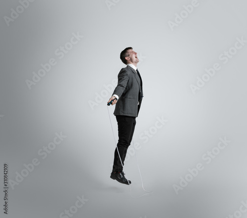 Back in childhood. Feels like free bird. Man in office clothes training with jumping rope on grey background. Unusual look for businessman in motion, action. Sport, healthy lifestyle, working.