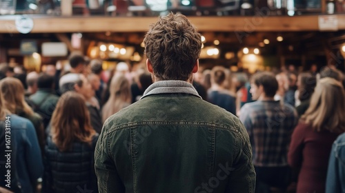 man, crowd, people, back, hair, venue, blurred, indoor, social, gathering, group, anonymous, public, event, atmosphere, lifestyle, leisure, entertainment, nightlife, bar, pub, eatery, celebration, party, adult, male, person, backview, sharpened, unrecognizable, human, together, community, connection, interaction, warm light, rustic, cosy, casual attire, standing, observation, point of view, audience, spectator, socialising, tied-up, humid, urban