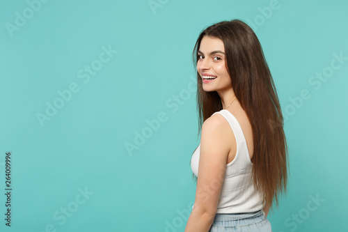 Back rear view of smiling pretty young woman in light casual clothes looking back isolated on blue turquoise wall background in studio. People sincere emotions, lifestyle concept. Mock up copy space.