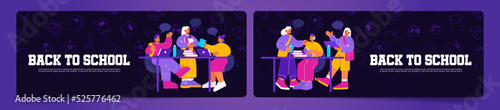 Back to school flyer templates set. Flat vector illustration of happy students sitting at desk, studying, communicating, using laptop, reading books on dark background with doodle education icons