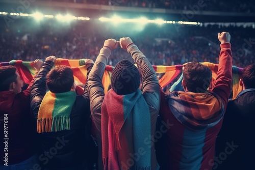 pride, gay, flag, rainbow, backview, fan, support, stadium, match, crowd, people, group, holding, hand, fist, soccer, fan, background, game, celebrate, team, championship, fun, competition, stand, happy, event, together, gay pride, emotion, friendship, young, man, success, celebration, outdoors, excitement, supporter