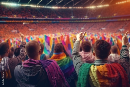 pride, gay, flag, rainbow, backview, fan, support, stadium, match, crowd, people, group, holding, hand, fist, soccer, fan, background, game, celebrate, team, championship, fun, competition, stand, happy, event, together, gay pride, emotion, friendship, young, man, success, celebration, outdoors, excitement, supporter