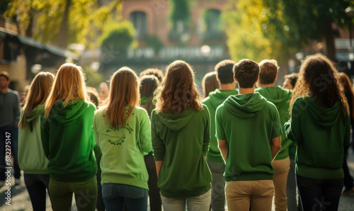 Back view group of people dressed in various shades of green clothes outdoors celebrating St Patrick's day