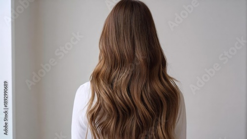 Back view of a person with long, wavy light brown hair wearing a white top. Concept Back view portrait, Long wavy light brown hair, White top outfit, Hair movement, Soft natural light
