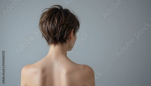 woman, female, short hair, backview, minimalist, skin, portrait, studio shot, aesthetic, beauty, elegance, youth, natural, fashion, contemporary, wellness, spa, confidence, coiffure, neck, delicate, feminine, posture, smooth skin, photo, model, back, profile, closeup, natural light, serene