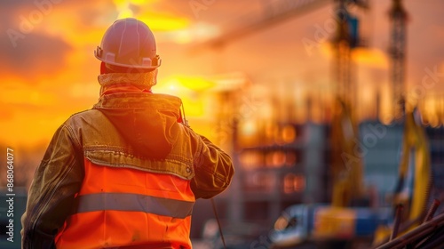 Back view of construction engineer in standard safety looking at the building in the construction site