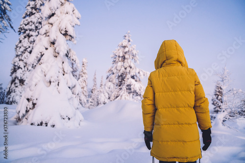 Back view of female in yellow warm coat standing on snowy natural environment during wanderlust destination exploring, woman traveler looking at frozen snowy trees in winter wood