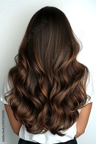 Back view of long wavy brunette hair with subtle caramel balayage highlights styled in loose curls showing professional salon result against white background.
