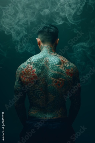 Back view of tattooed man standing in smoke filled room, showcasing intricate dragon and floral body art, symbolizing mythical atmosphere of Yakuza crime syndicate