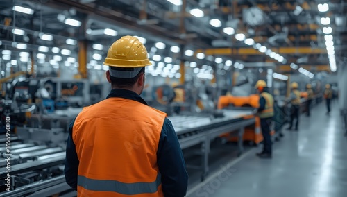 Back view of worker in hard hat and safety vest in factory with conveyor belt and other workers