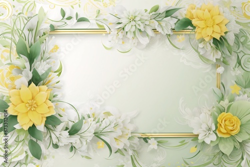 Background for party, birthday, wedding or graduation invitation in white color with floral frame with colorful decorations in soft art style. Generative Ai.