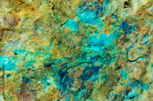Background from dracocene crystals of stones. Fluorite stone in the rocks of the adit. Mineral stones in their natural environment. Semiprecious stones texture.