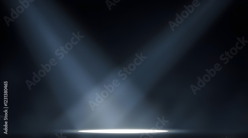 Background image, Bright spotlights converge, illuminating a circular stage area against a dark background. The intersecting beams create a dramatic and focused ambiance.