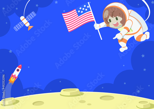 cartoon, illustration, vector, moon, star, children, woman, sky, art, children, card, star, drawing, space, astronaut, flag, space station, rocket, background, children, frame