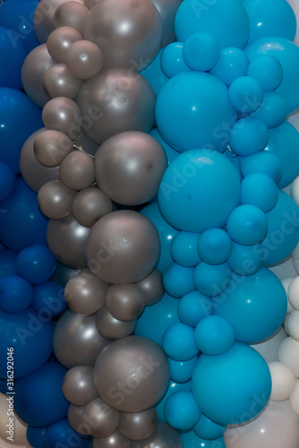 background of many white, blue, gray balloons. Blue and gray balloons on the birthday party