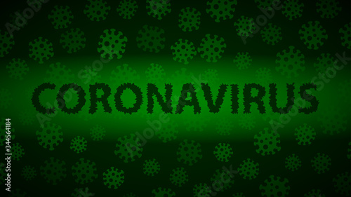 Background with viruses and inscription CORONAVIRUS in dark green colors. Illustration on the covid-19 pandemic.