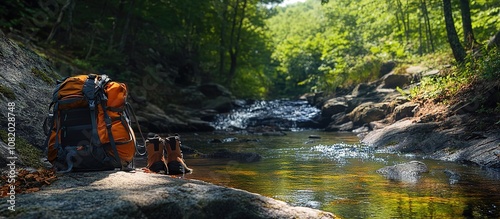 backpack, boot, stream, forest, nature, rock, water, hiking, adventure, outdoors, exploration, calmness, landscape, sunlight, tree, leisure, travel, scenery, terrain, journey, camping, equipment, footwear, wilderness, environment, relaxation, path, river, stone, greenery, summer, peaceful, escape, solitude, natural, beauty, fresh, air, activity, fun, scenic, wild, life events, freedom