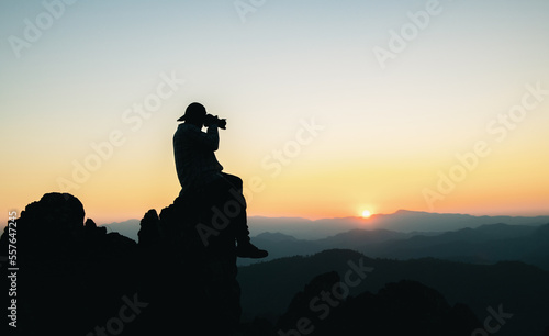 Backpacking hikers hold binoculars, relax on top of the mountain and enjoy views of the valley during sunset.