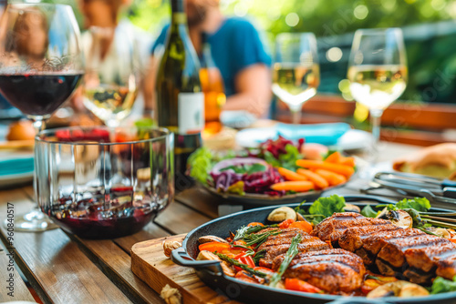 Backyard dinner table have a tasty grilled BBQ meat, Salads and wine with happy joyful people on background