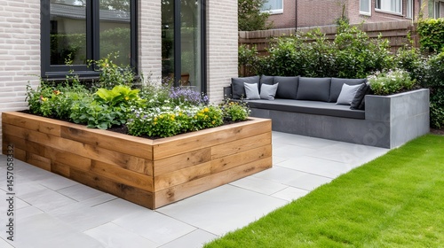 backyard, raised, wooden, modern, stone, seating, garden, design, patio, terrace, landscaping, flower, plant, wood, planter, decor, greenery, nature, contemporary, cosy, relaxation, urban, architecture, vegetation, foliage, texture, harmony, calmness
