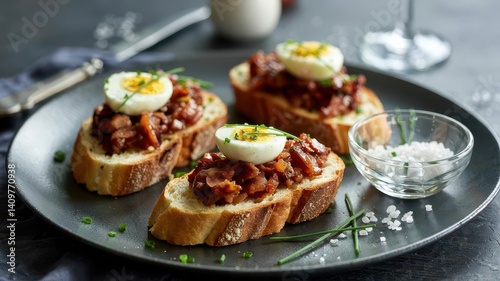 Bacon jam bruschetta topped with quail eggs on black ceramic plate, gourmet appetizer with caramelized onions and fresh chives, sea salt flakes in glass bowl, studio lighting, fine dining