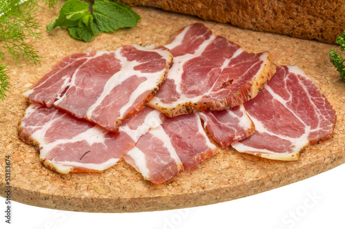 arrangement, background, bacon, baked, bread, breakfast, cholesterol, closeup, cold, colours, cook, cookery, cut, dill, dinner, eat, eating, fat, food, garlick, epicure, green, group, ham, herb, isolated, italian, macro, meal, meat, mint, nourishment, parma, parsley, pork meat, preparation, salted, salty, sausage, section, slice, smoked, snack, studio, tasty, tomatoes, traditional
