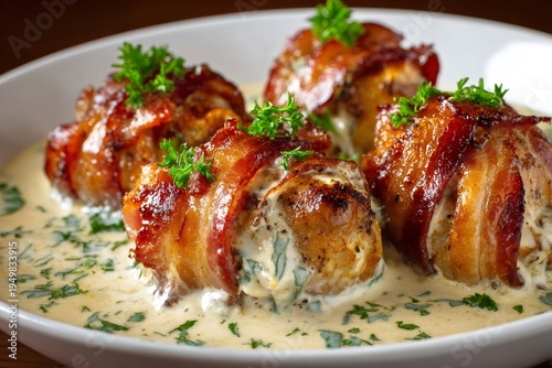 bacon, chicken, medallion, parsley, epicure, dinner, food, cookery, meal, delicious, savoury, cooked, dish, homemade, eatery, presentation, plating, receipe, rich, comfort food, eating, healthy eating, protein, gastronomy, special occasion, celebration, festive, fine dining, side dish, main course, culinary, chef, professional, poultry, wrapped, stuffing, filling, cheese, spinach, herb, cream, sauce, plate, white bowl, closeup