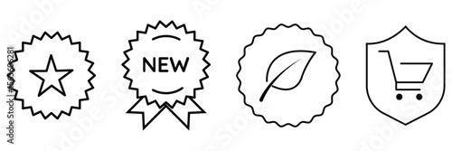 badge, e-business, shopping, secure, quality, eco, leaf, star, cart, label, emblem, ribbon, stamp, minimal, outline, clean, design, guarantee, safe, certified, approved, new, sale, organic, environment, trusted, commerce, protection, checkout, buy, purchase, online, line art, insignia, symbol, assurance, modern, editable, monochrome, web, branding, graphic, retail, shopping cart, product, element