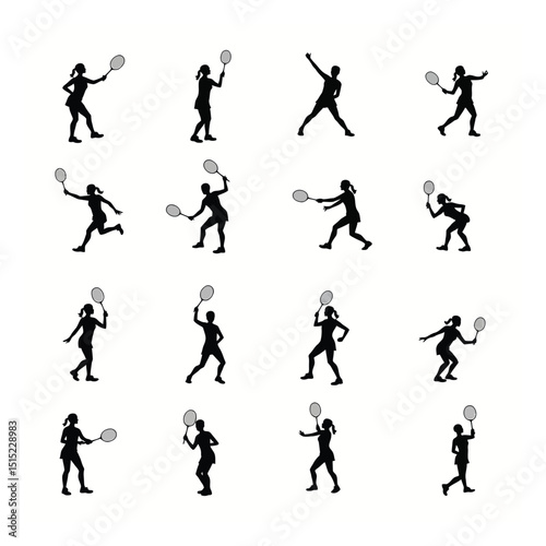 badminton, female, player, set, silhouette, action, pose, sport, athlete, woman, girl, racket, shuttlecock, competition, exercise, fitness, active, dynamic, vector, illustration, graphic, design, black, white, background, isolated, game, activity, healthy lifestyle, training, practice, movement, energy, power, skill, technique, strength, agility, speed