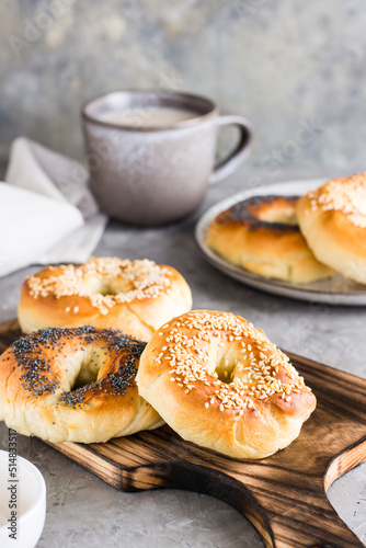 Bagels with poppy seeds and sesame seeds on a plate and a cup of coffee on the table. Vertical view