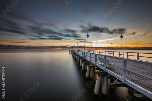Bajeczny, kolorowy wschód słońca nad molem w Orłowie. Gdynia Polska