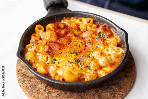 Baked macaroni and cheese with fresh tomato sauce served on hot pan