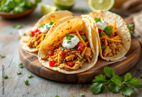 taco, pulled, chicken, cheese, sour, cream, salsa, mexican, wooden, lime, board, tortilla, food, meal, delicious, meat, fresh, lunch, dinner, table, corn, cilantro, sauce, snack, pepper, vegetable, spicey, green, cookery, traditional