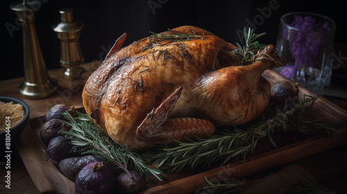Baked turkey with rosmary, food photo, restaurant serving, mouth-watering food, light boke, bunch of christmas tree, festive, wooden table and wall, orange slices, smoke