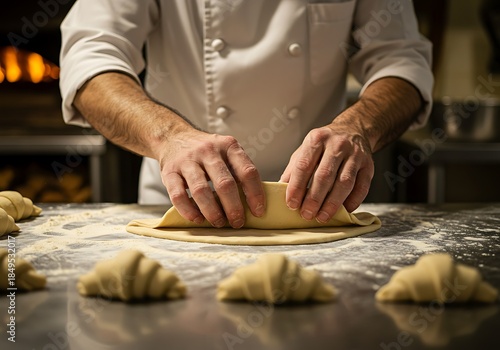baker, hand, dough, pastry, croissant, food, baking, cooking, preparation, rolling, flour, kitchen, table, surface, closeup, process, craft, artisan, fresh, gold, texture, ingredient, commercial, professional, chef, making, hand-made, receipe, bakery, detail, warm, light, breakfast, culinary, delicious, homemade, work, skill, sharpened, creating, food industry