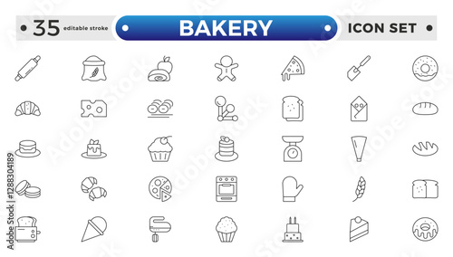 Bakery and dessert outline icon. Contains such Icons as cookie, pudding, oven, kitchen tools, doughnut, bread, macaroon, muffin And Other Elements. customize color. Editable stroke outline icon.