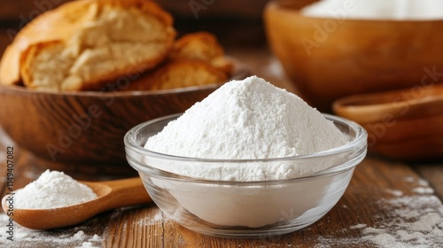 Baking soda in a transparent container, sitting next to a bowl of freshly mixed dough.