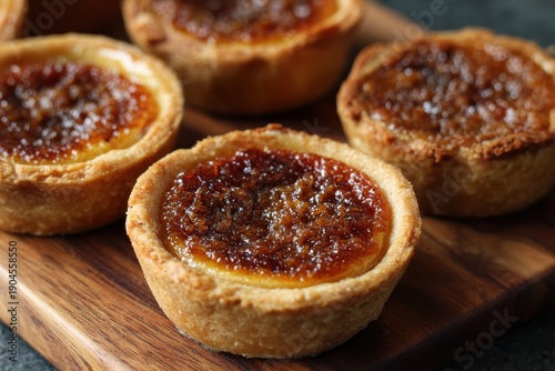Baking traditional tarts with custard filling and caramelized sugar on top in a kitchen setting