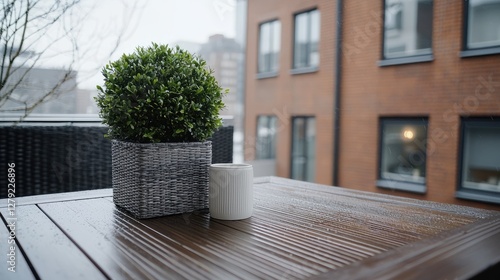 balcony, table, plant, rainy, day, city, view, potted, outdoors, decor, wooden, modern, apartment, building, urban, exterior, weather, cosy, home, relaxing, morning, afternoon, green, grey, white, small, pot, decoration, lifestyle, calm, tranquil, space, architecture, city landscape, detail, closeup, empty, rustic, fresh, nature, freshness, light, stylish, design, beautiful, charming