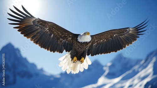 bald, eagle, bird, bird of prey, soaring, flying, wing, feather, mountain, mountain, snow, snowy, winter, sky, blue, bright, sunny, day, nature, wildlife, majestic, powerful, freedom, predator, sharp, talon, beak, eye, head, white, brown, black, background, landscape, view, air, high, elevation, altitude, outdoors