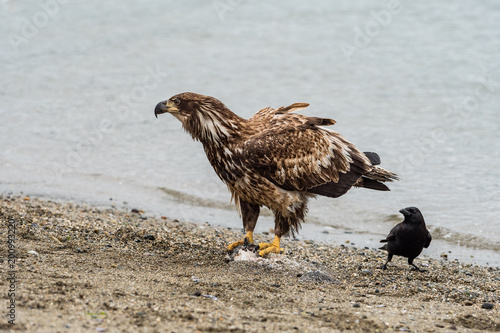 bald eagle standing on its meal while a crow stand aside