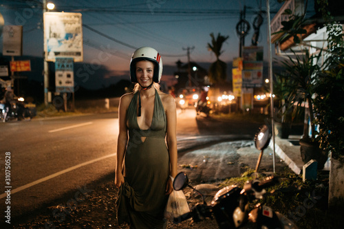 sunset, sun, street, sea, scooter, road, ocean, nature, helmet, evening dress, dress, city, beach, bali, tanah lot, water, urban, travel, caucasian, white, woman, girl, female, person, people, adult, adult, 20s, grown-up