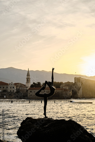 morning, sunrise, rock, stone, citadel, adriatic, house, surf, coast, fortress, mountain, building, water, sculpture, ballerina, statue, dancer, travel, ballet, girl, coastline, figure, scenic, bronze, gymnast, symbol, nature, art, balkans, female, woman, famous, resort, bay, beauty, scene, silhouette, pose, standing, shoreline, sunlight, body, fitness, balance, yoga