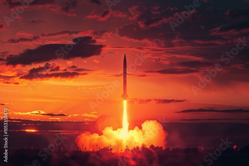 missile, ballistic, launch, sunset, sky, dramatic, fire, explosion, power, military, weapon, danger, war, conflict, defense, rocket, space, technology, speed, destruction, army, nuclear, threat, global, politic, government, international, relation, tension, fear, strength, force, attack, strategic, test, intercontinental, system, warfare, national, security, arm, race, dusk, evening, cloud