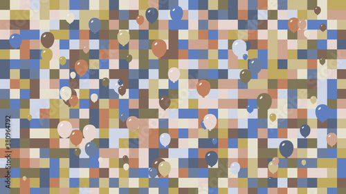 Balloons in front of geometric squares with blue and brown colors. Checkered background with large squares and shapes.
