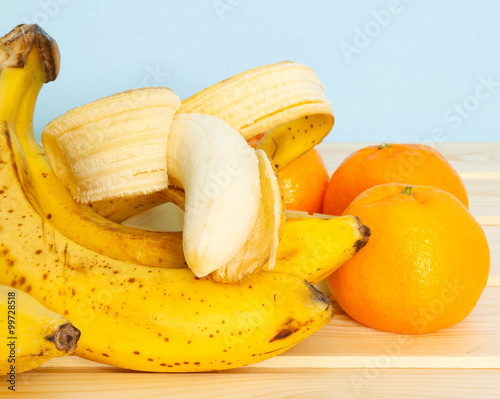 Bananas, mandarines on wooden table
