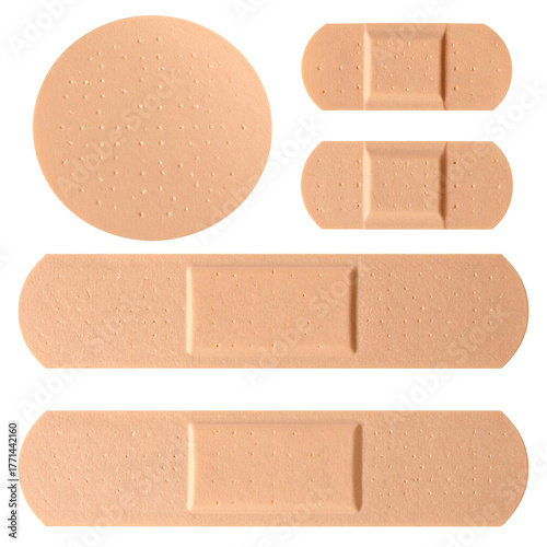 Bandage Variations: An array of adhesive bandages, showcasing different shapes and sizes, ready for first aid application and wound care.